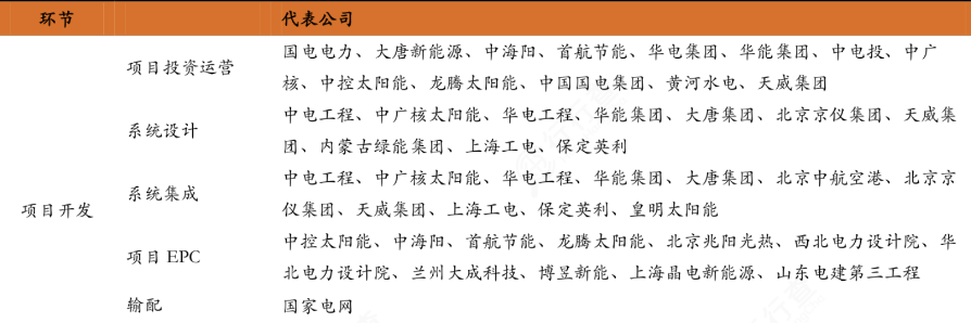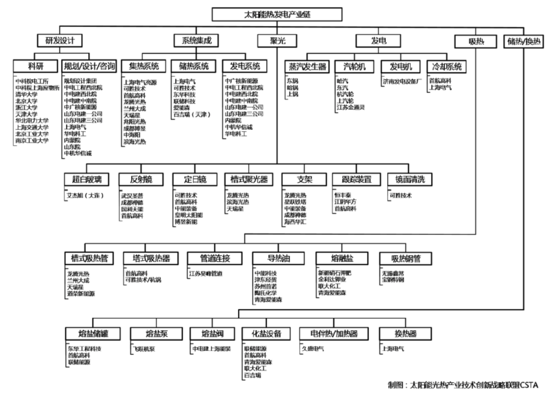 国内光热发电产业链主要厂商包括首航高科(电站投资与EPC、空冷岛)、三维化学(储热岛EPC)、上海电气(电站投资与EPC)、爱康科技(电站投资与EPC)、特变电工(电站投资与EPC)、金通灵(汽车轮机)、山东北辰(蒸汽发生器、换热器)、金晶科技(反射镜超白玻璃原片)、洛阳玻璃(反射镜超白玻璃原片)、久立特材(光热发电特种管材供应)等。