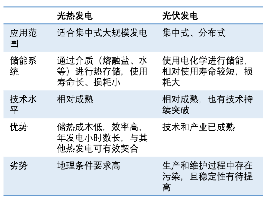 光热发电和光伏发电是太阳能发电的两种形式。光伏发电是利用太阳能电池的光生伏特效应,将太阳辐射能直接转化为电能;而光热发电是经过“光能-热能-机械能-电能”的转化过程实现发电。