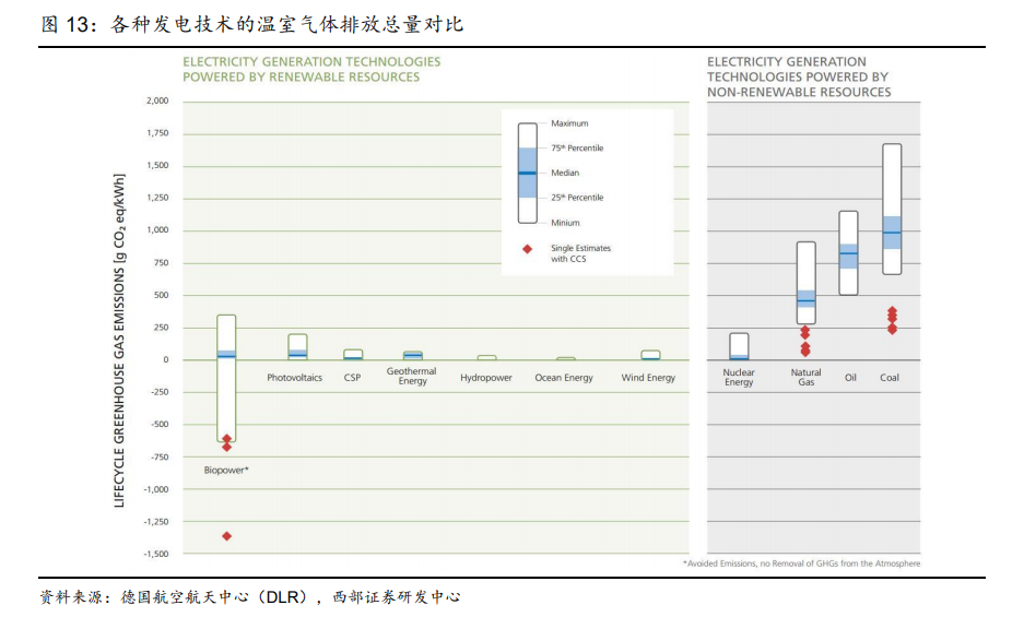 5)低碳、无污染:光热发电全生命周期度电碳排放仅为火电的 1/50、光伏发电的 1/6,具有良好的生态环境效益,可助力双碳目标的实现。