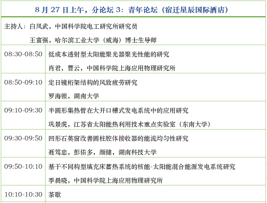 为进一步引导青年学者创新创效,搭建一个太阳能光热科学技术研究的交流平台,将于8月26-27日在江苏宿迁召开的第六届中国太阳能热发电大会上特别设置“青年论坛”。