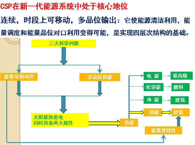 国家太阳能光热联盟常务副理事长王志峰和浙江大学博士生导师肖刚合作完成的《太阳能热发电在新一代能源系统中的定位》报告指出:要定位好太阳能热发电的作用,首先要定位好可再生能源在新一代能源系统中的核心地位。因为电网面临波动的可再生能源电力这一新的挑战,当大规模新能源电力为电力输送的分配源端时,需要灵活高效地将可再生能源电力并网和传输融入到电力发展中。新的形势要求电网能根据用电峰值不同,在不同可再生能源交替使用的情况下,在不同时间段可以满足用户侧的使用需求,不会因为某一可再生资源的供给不稳定而影响用户侧的使用。如何调节供给侧和需求侧在不同时间的需求矛盾呢?太阳能热发电技术及其储热技术不仅可以保证供电的稳定性、平滑性,还能降低发电成本,是保证新一代能源系统运作顺畅的最优选择。