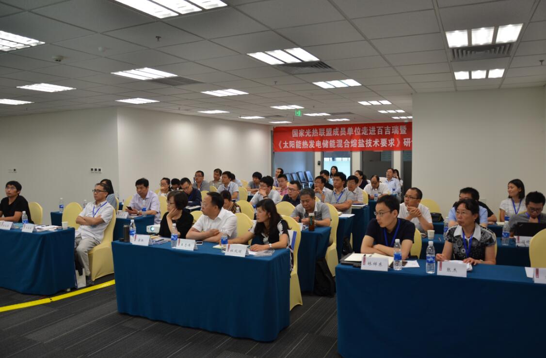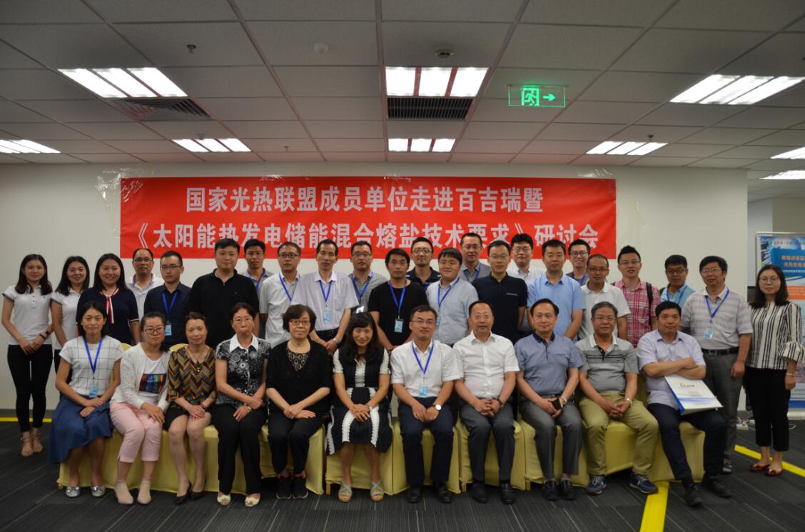 按照国家光热联盟2017年工作计划,受百吉瑞(天津)新能源有限公司(下文简称百吉瑞)邀请,6月28日,国家光热联盟组织成员单位“走进百吉瑞”,并同期召开了“熔融盐储热技术研讨会”和“联盟标准《太阳能热发电储能混合熔盐技术要求》研讨会”。来自北京工业大学、北京天瑞星光热技术有限公司、北京国电智深控制技术有限公司、北京启迪清洁能源科技有限公司、浙江联大化工股份有限公司、山东力诺瑞特新能源有限公司、内蒙古电力勘测设计院有限责任公司、康达新能源设备股份有限公司、上海电气电站集团、新疆硝石钾肥有限公司、电力规划设计总院、深圳市爱能森科技有限公司、江苏联储能源科技有限公司、天津滨海光热发电投资有限公司、武汉圣普太阳能科技有限公司、中国华电科工集团有限公司、中广核工程有限公司、浙江中控太阳能技术有限公司、旭硝子特种玻璃(大连)有限公司、中机华信诚电力工程有限公司等光热联盟成员单位代表共计40余人参加了本次互访活动。