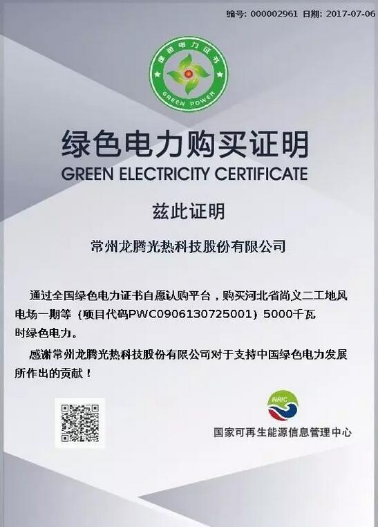 7月1日,国家能源局在北京组织召开了绿色电力证书自愿认购启动仪式,并同步举办“推广绿证自愿认购暨首届中国绿色电力高峰论坛”,开启了倡导全社会消费绿色电力的新时代。龙腾光热作为一家新能源企业,在发布会后响应国家号召,立即组织采购了河北华电尚义风力发电有限公司的5张绿色电力证书,覆盖了公司总部7月份的办公用电。未来,公司将采购足够的绿色电力证书来确保总部办公大楼100%使用绿色电力,继续为太阳能光热发电提供优质的核心组件,同时加大光热项目开发力度,为社会提供更多清洁电力。