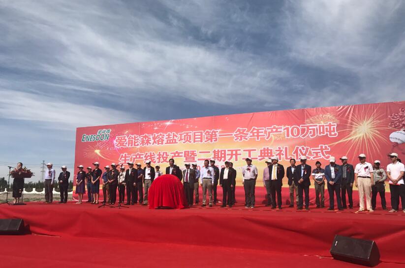 2017年8月5日,在各级政府、行业专家及社会各界的关怀与支持下,爱能森第一条年产10万吨熔盐生产线暨拥有自主知识产权的熔盐智能化生产线在德令哈落成投产。为答谢各界对爱能森一直以来的指导、关心与支持,爱能森熔盐项目第一条年产10万吨生产线投产暨二期开工典礼在德令哈工业园区隆重举行。