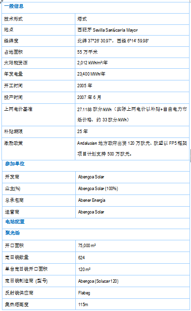 PS20电站紧邻PS10电站,吸热器较其前身有了明显改进。例如,将吸热器设计成自然循环形式,并提高入射太阳辐射捕获能力可以将净发电量提升10个百分点。160米的集热塔也进行了减少视觉冲击的设计。PS20电站的相关信息见表2。