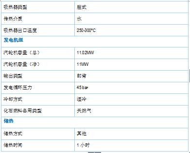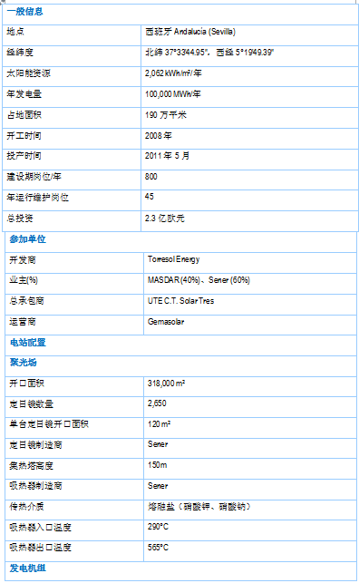 Gemasolar电站是全球首座采用熔融盐作为传热介质的商业化塔式电站。电站容量19.9MW,于2011年5月投入商业化运行,可以满足西班牙安达鲁西亚地区的25000户家庭的用电需求。Gemasolar电站的储热时间为15小时,能够在一年中的多个月份实现24小时不间断发电,从而克服了由于太阳能间歇性的特点所导致的电力输出不稳定的缺点。Gemasolar电站的相关信息见表3。