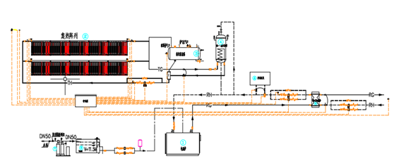 主要设备:CPC中温集热器、高位膨胀罐、油气分离器、相变蓄热装置、泵、油水换热器;
