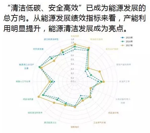 ▶2017年,“清洁低碳、安全高效”已成为能源发展的总方向。从能源发展绩效指标来看,产能利用明显提升,能源清洁发展成为亮点。
