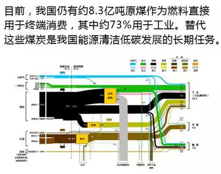 ▶ 根据对能流图的分析,2017年,我国电能占终端能源消费的比重同比提高1个百分点,但仍有约8.3亿吨原煤作为燃料直接用于终端消费,其中约73%用于工业。替代这些煤炭是我国能源清洁低碳发展的长期任务。