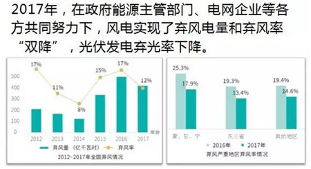 ▶从供应方面来看,2017年的热点问题主要有四个,一是在政府能源主管部门、电网企业等各方共同努力下,风电实现了弃风电量和弃风率“双降”,光伏发电弃光率下降。