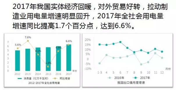 ▶三是因为2017年我国实体经济回暖,对外贸易好转,拉动制造业用电量增速明显回升,2017年全社会用电量增速同比提高1.7个百分点,达到6.6%。