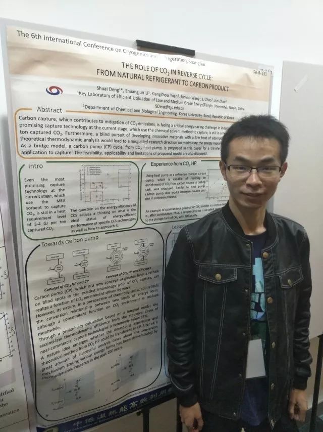 2. (Poster) S. Deng, S.J. Li, X.Z. Yuan, J.Y. Wang, L. Zhao, J. Zhao. The role of CO2 in reverse cycle: from natural refrigerant to carbon product [C]. The 6th International Conference on Cryogenics & Refrigeration (ICCR2018). Shanghai, 2018, 4.12-14. PA-R-131.