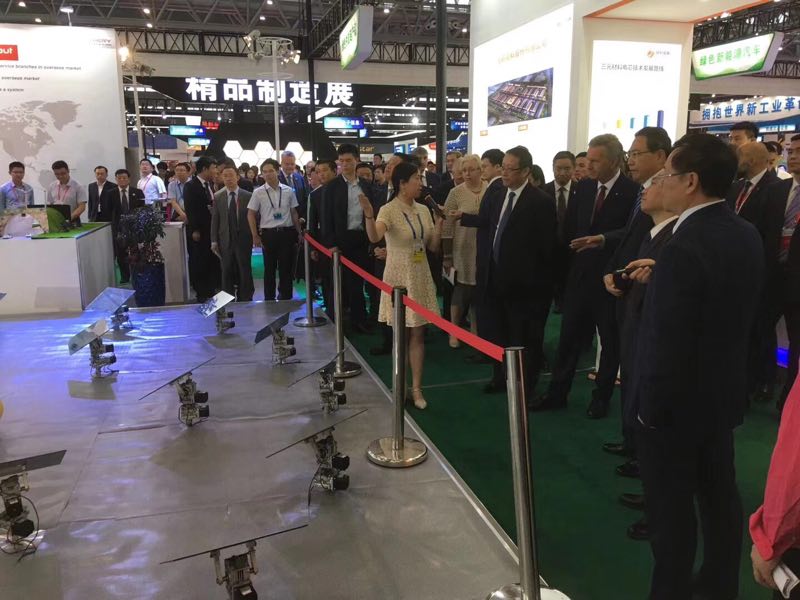 在25日上午的巡馆过程中,工信部副部长辛国斌参观了安徽延达的展区,董事长张梅向辛部长一行详细介绍了公司全自主研发的塔式太阳能热发电、储能、隧道节能和海水淡化技术及产品。她说:安徽延达自主研发的塔式光热发电定日追踪系统精准、高效、维护成本低廉,已经获得国家多项发明专利;2017年已签订了2份塔式光热发电技术总服务合同,同时,采用塔式光热发电技术实现清洁能源供暖的光热小镇项目也进入了申报程序。