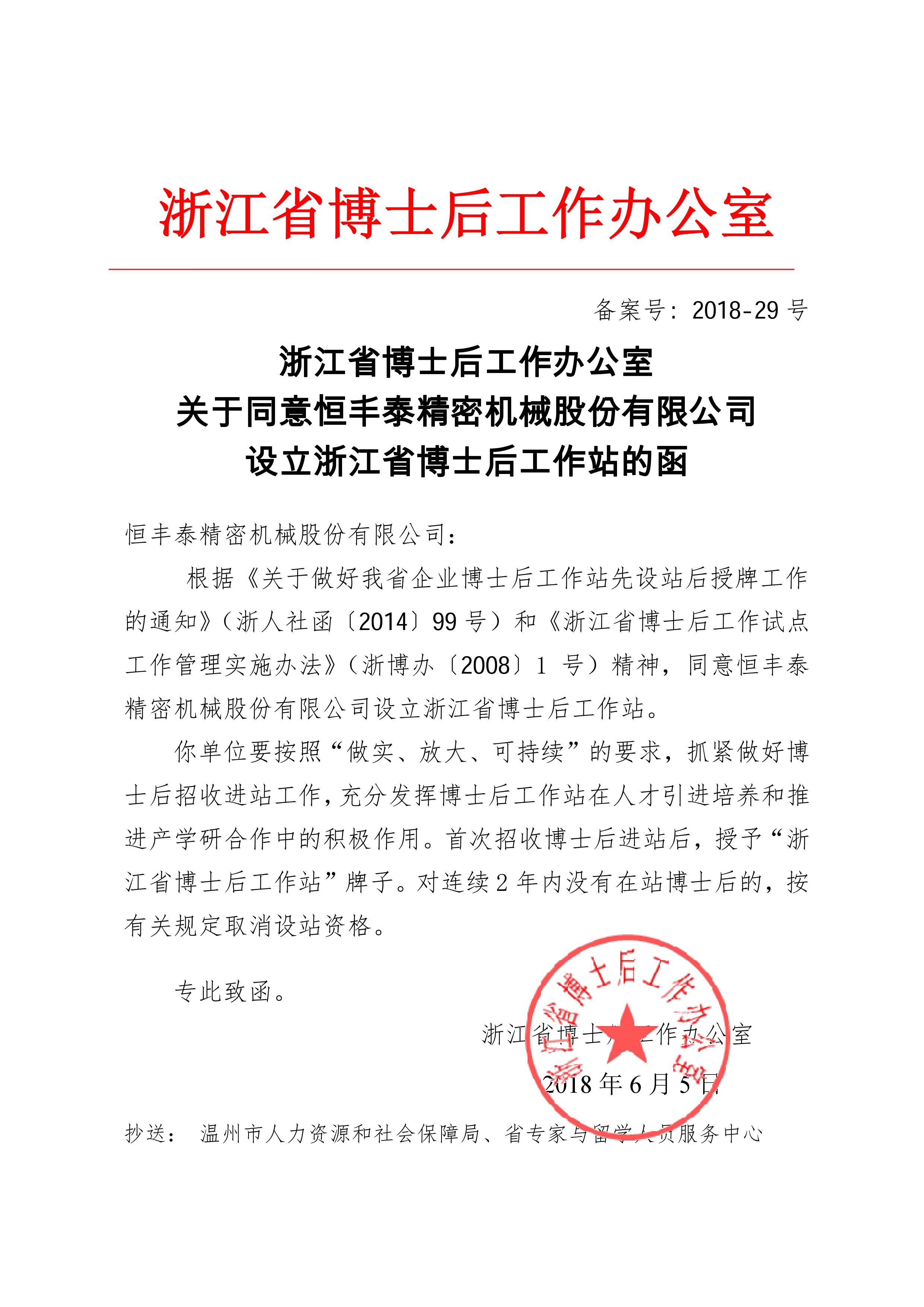 浙江省博士后工作办公室同意恒丰泰精密机械股份有限公司设立浙江省博士后工作站