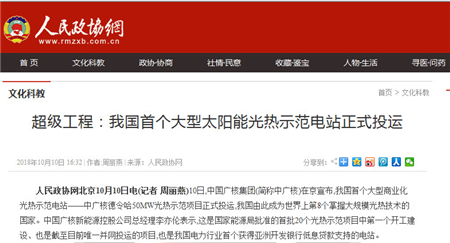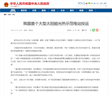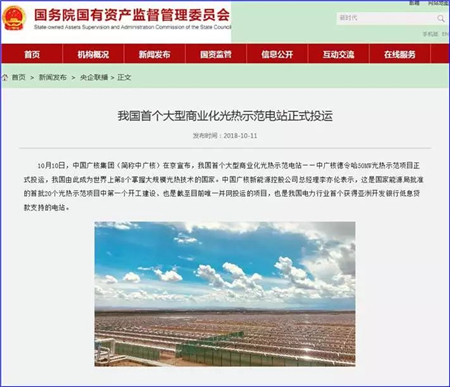 国务院国资委官网刊发《我国首个大型商业化光热示范电站正式投运》