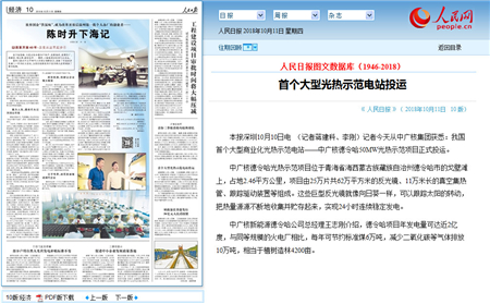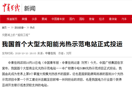 《中国青年报》刊发《戈壁滩上的“超级工程” 我国首个大型太阳能光热示范电站正式投运》