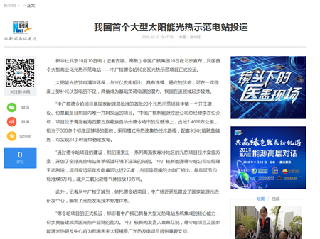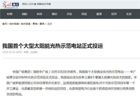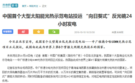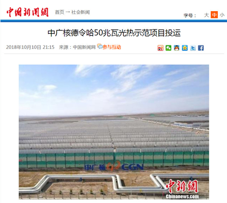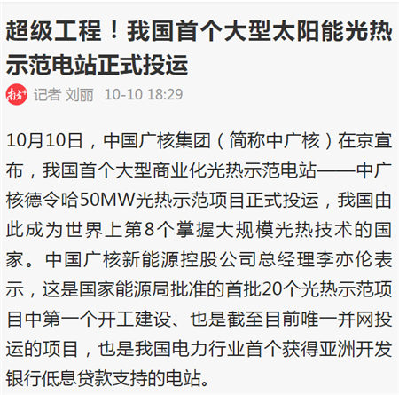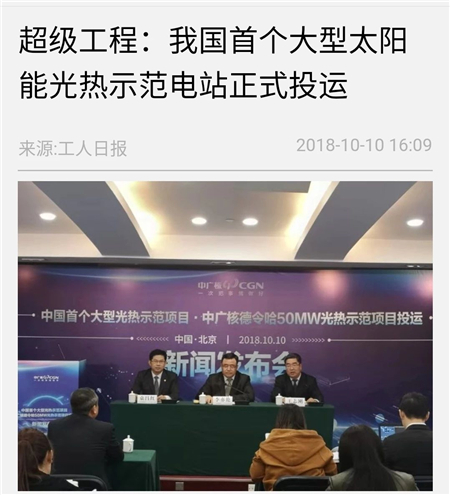 10月10日,中国广核集团(简称“中广核”)在京召开新闻发布会宣布,我国首个大型商业化光热示范电站——中广核德令哈50MW光热示范项目正式投运,我国由此成为世界上第8个掌握大规模光热技术的国家。这一消息引起全国媒体高度关注,超过50家媒体刊发了首发报道,在电视、报纸、网站上出现井喷式的刷屏,一起来看部分媒体的精彩报道吧。