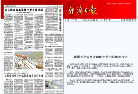 《经济日报》刊发《我国首个大型太阳能光热示范电站投运》