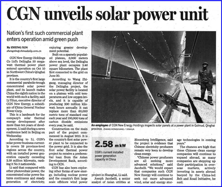 《中国能源报》刊发《我国首个大型太阳能光热示范电站正式投运》