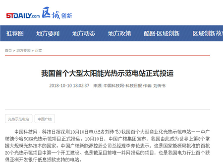 《科技日报》刊发《我国首个大型太阳能光热示范电站正式投运》