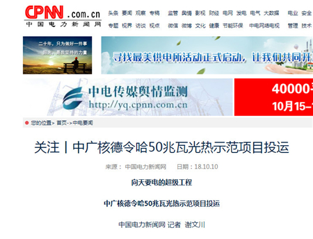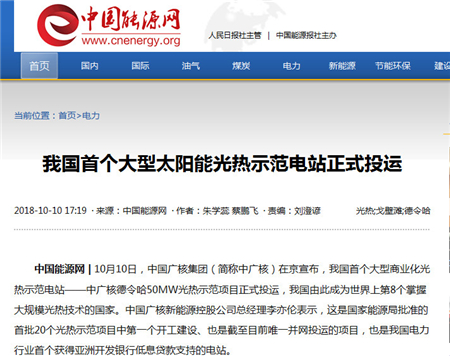 中国电力新闻网刊发《关注丨中广核德令哈50兆瓦光热示范项目投运》
