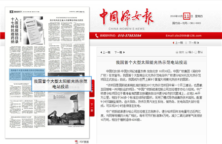 《中国妇女报》刊发《我国首个大型太阳能光热示范电站投运》
