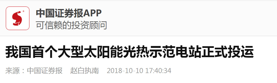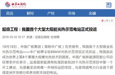 《中国证券报》刊发《我国首个大型太阳能光热示范电站正式投运》