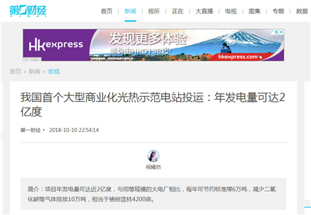 第一财经刊发《我国首个大型商业化光热示范电站投运:年发电量可达2亿度》