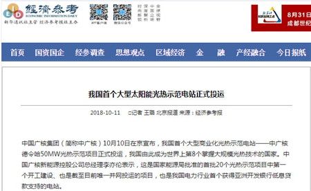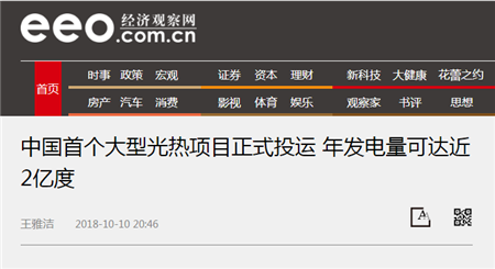经济观察网刊发《中国首个大型光热项目正式投运 年发电量可达近2亿度》