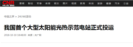 CCTV《新闻联播》播发《我国首个大型光热电站投运》