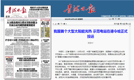 《青海日报》刊发《我国首个大型太阳能光热 示范电站在德令哈正式投运》