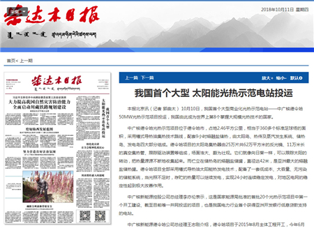 《柴达木日报》刊发《我国首个大型 太阳能光热示范电站投运》