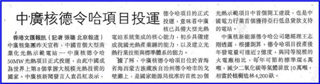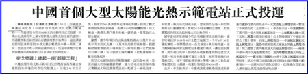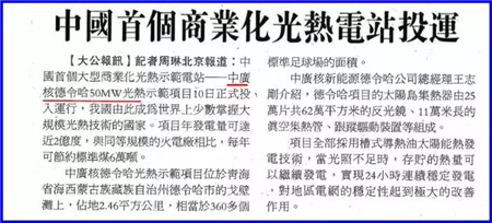 《香港商报》刊发《中国首个大型太阳能光热示范电站正式投运》