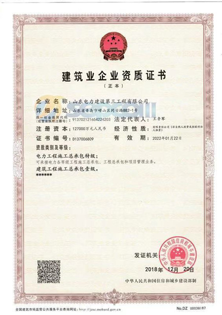 日前,国家住房和城乡建设部发布了“关于核准2018年度第十批建设工程企业资质名单的公告”,山东电力建设第三工程有限公司(简称山东电建三公司)申报的“建筑工程施工总承包一级”资质喜获核准通过。