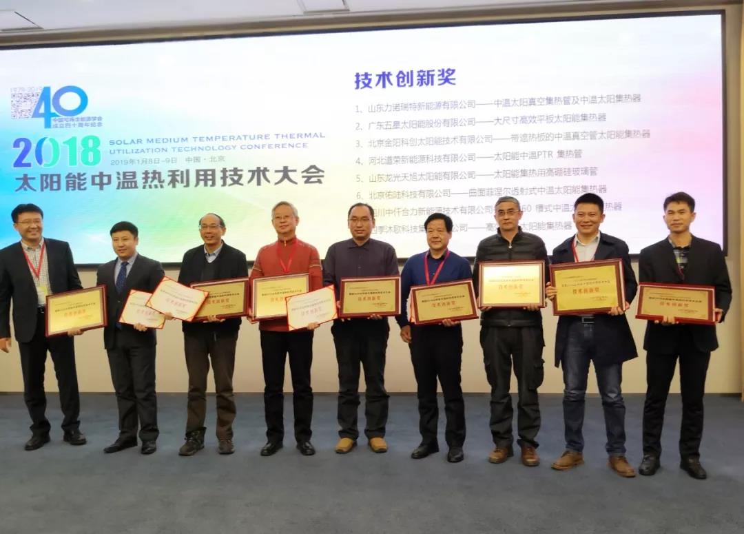 本次大会还进行了颁奖。其中,殷志强、马重芳、李申生、郑瑞澄四位老专家获得2018太阳能中温热利用技术大会“杰出贡献人物奖”,山东力诺瑞特新能源、广东五星太阳能、河北道荣新能源、四季沐歌等企业的12个技术与工程项目分别获得大会“技术创新奖”和“工程创新奖”,天津大学中低温热能高效利用教育部重点实验室等11篇论文获得了大会“优秀论文奖”。
