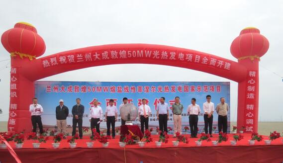 兰州大成敦煌一期5万千瓦熔盐线性菲涅耳式光热发电国家示范项目由兰州大成科技股份有限公司申报,经国家能源局批准(国能新能[2016]223号)入选国家光热发电首批示范项目,且已入选2017年甘肃省省列重大项目,是首批20个示范项目中唯一由甘肃省本土高新技术企业申报并提供核心技术及承担太阳能集热场建设任务的国家光热发电示范项目。项目由兰州大成投资,项目于2017年开工建设。2018年6月,兰州大成与中国电建集团中南勘测设计研究院有限公司签订EPC总承包后,开始全面建设,计划于2019年7月~9月份建成发电。(董清风 报道)