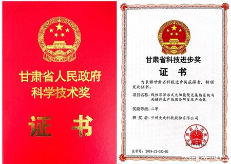 会中,由兰州大成科技股份有限公司(下文简称兰州大成)主持完成的“线性菲涅耳式太阳能聚光集热系统与关键件生产线装备研发及产业化”项目成果荣获2018年度甘肃省科技进步奖二等奖。项目第一完成人兰州大在副总经理范多进教授级高工代表公司参加了此次奖励大会并接受表彰。此次获奖是线性菲涅耳式聚光集热技术首次获得省部级奖励。