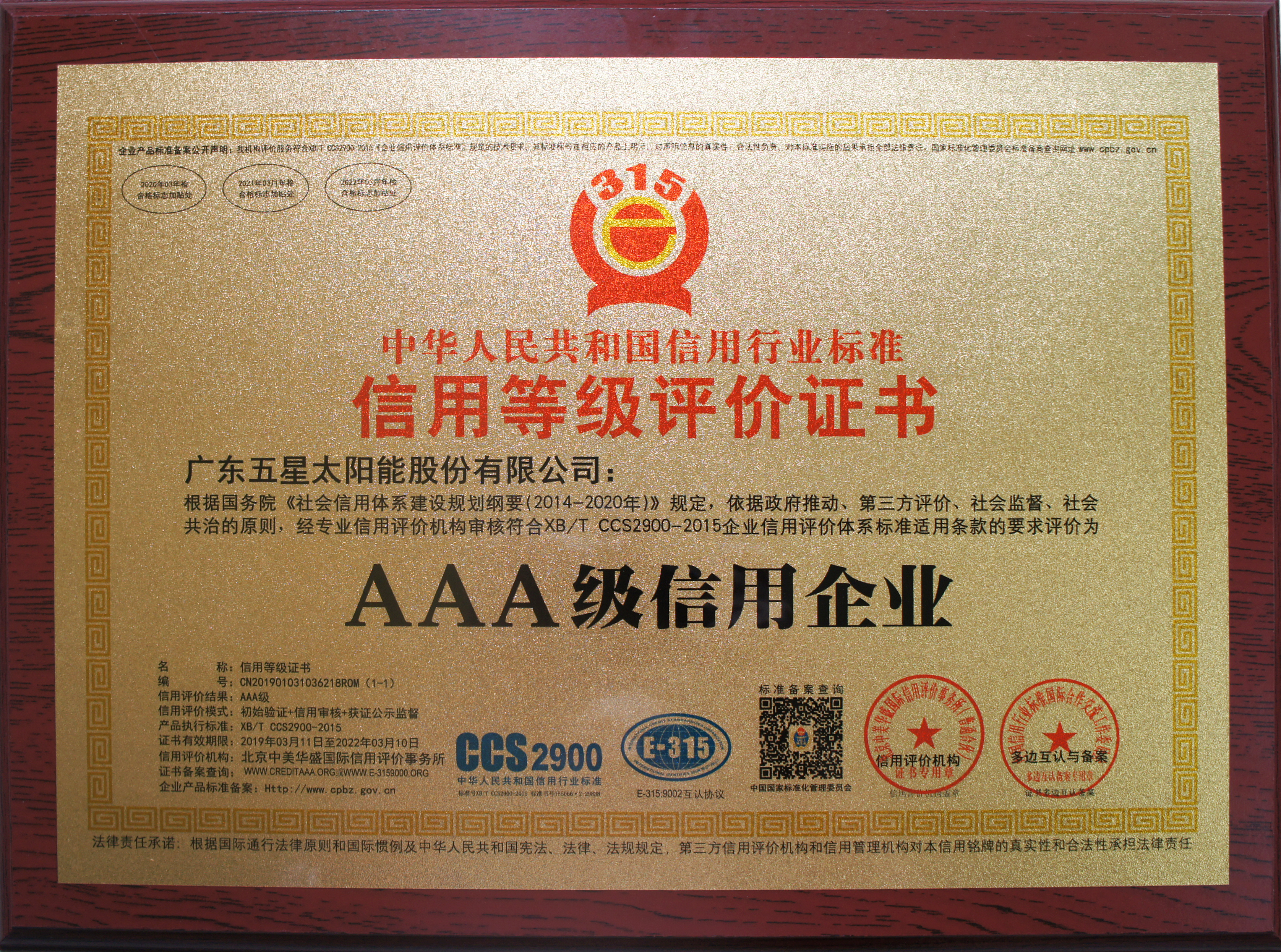 近日,广东五星太阳能股份有限公司(简称五星太阳能)再次收到了最高信用等级的中华人民共和国信用行业标准AAA级信用企业认证证书,这是五星太阳能继2015年获得国家3A等级信用证书后,在诚信规范化建设方面再次得到了相关政府机构和公众的认可。