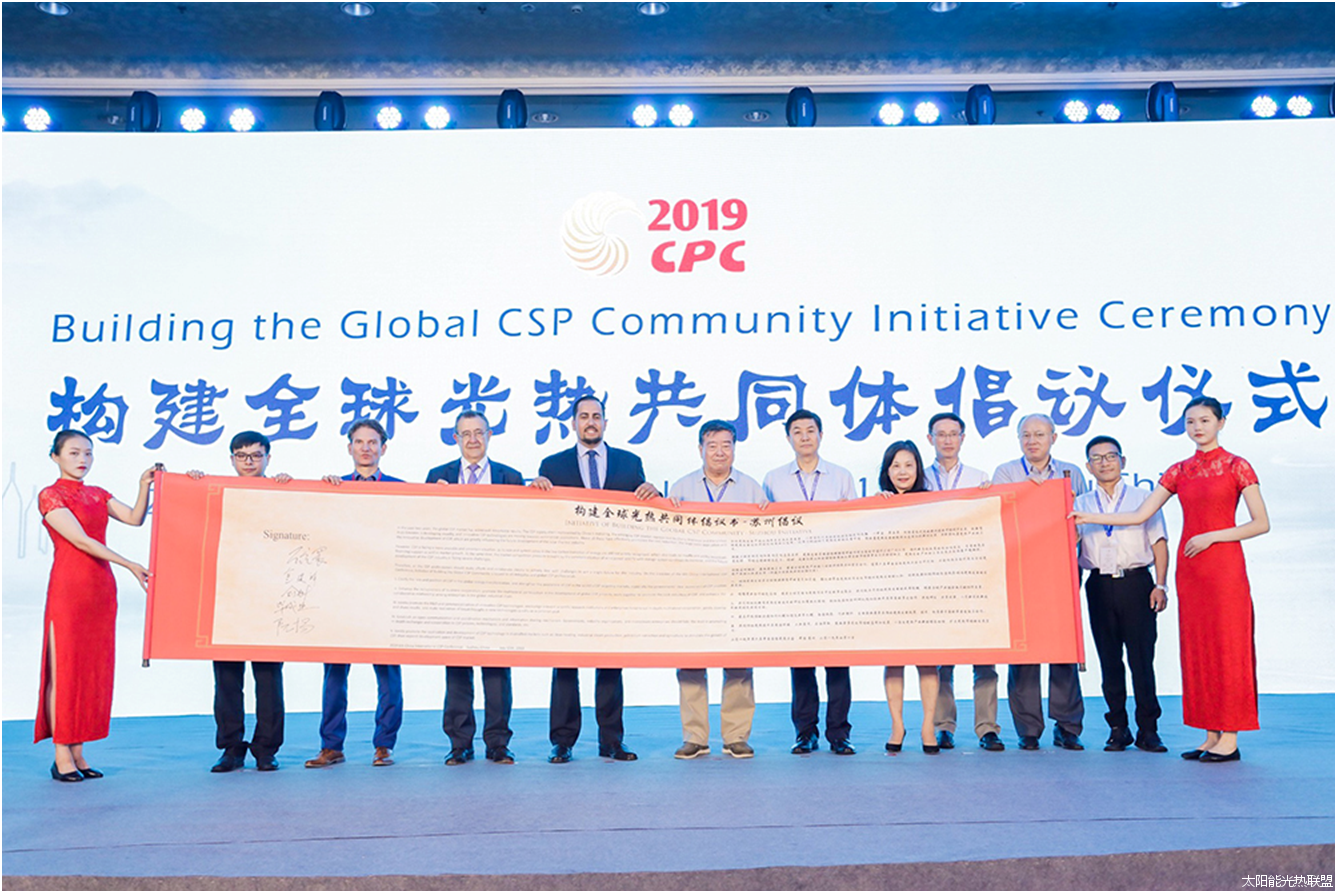 上午,在与会代表的共同见证下,本届大会成功举办了全球光热共同体倡议仪式,并发布了《构建全球光热共同体》倡议书,国际可再生能源署IRENA高级代表Simon Benmarraze、中国可再生能源学会原理事长、原国务院参事石定寰、西班牙光热发电协会主席、欧洲太阳能热发电协会前主席Luis Crespo、电力规划设计总院副院长孙锐、德国太阳能热发电协会DCSP董事会成员OliverBaudson、国网能源研究院副院长 蒋莉萍、浙江中控太阳能技术有限公司董事长金建祥、常州龙腾光热科技股份有限公司总经理俞科、北京兆阳光热技术有限公司董事阮阳、北京首航艾启威节能技术股份有限公司常务副总经理毕成业参与了此次倡议仪式。