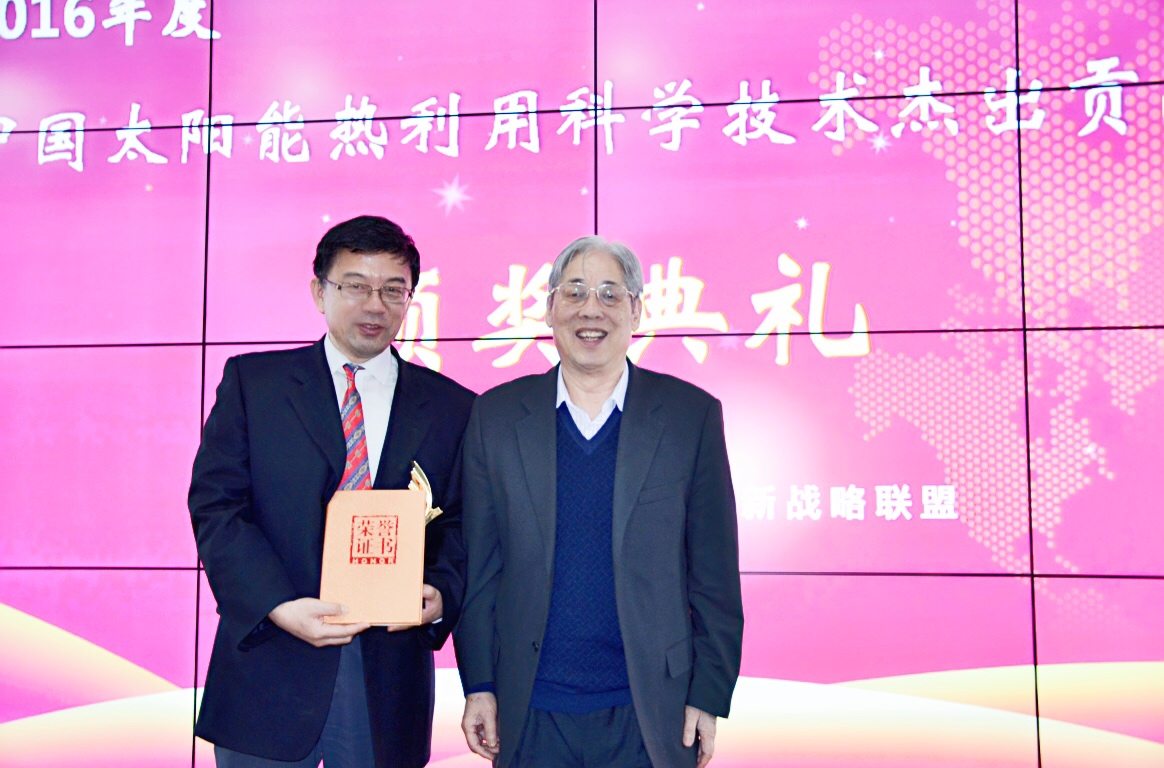 首届(2015年度)获奖者殷志强教授,始终秉持“高效率地开发太阳能资源,让大家得益”的初衷。为让太阳能真正造福于人民,1986年殷志强教授谢绝了清华大学电子系领导希望他能负责筹建国家重点高技术实验室的多次征询,而是选择走出实验室,选择了一条将科研成果民用化、产业化艰辛的道路。他先后与企业合作将一种新型涂层的全玻璃真空太阳能集热管进行小试(批量)生产。1989年清华大学电子工程系自筹资金进行全玻璃真空太阳能集热管成果转化中间试验,建立起中试生产线。到1992年,年产量达20万支。