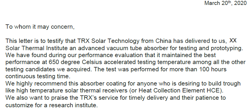 2020年3月,北京天瑞星光热技术有限公司(下文简称天瑞星)收到来自美国某研究机构的一封对天瑞星集热管产品使用的推荐信(见图1)。信中表示,“在其试验项目中,天瑞星集热管产品在650℃的超高温复杂工况下连续试验工作100小时以上,实现高温热稳定输出,是其选择的所有厂家集热管产品中性能表现最好的。”这是近年来天瑞星公司再次收到的又一国际权威研究机构的产品检测及推荐。(此前,天瑞星公司先后收到西班牙最大光热电站业主SAMCA集团等多家重量级客户的产品使用推荐信。)