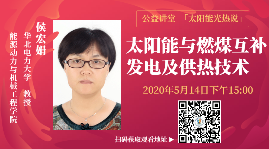 5月14日(周四)下午15:00,华北电力大学能源动力与机械工程学院侯宏娟教授将走进公益讲堂,与大家分享“太阳能与燃煤互补发电及供热技术”。