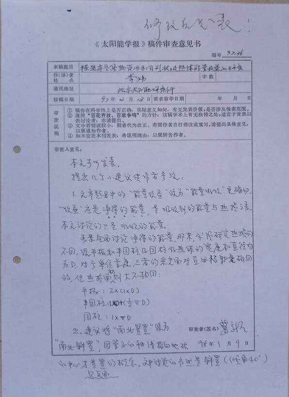 湖北金威新能源科技有限公司太阳能研发中心总监高元运先生,1981年成为了甘肃省科学院自然能源研究所一员。时逢中国太阳能学会交由中科院广州能源所主办太阳能热利用理论基础学习班,授课老师是由国内顶尖的学者和教授开课,其中就有葛新石教授,清华大学岑焕霞教授,天津大学李汉炎教授,北太所陆维德研究员。“在40天的授课学习中,学员不仅要做习题,还要学习平板集热器与聚焦集热器的课程设计,整个学习氛围十分紧张,学员在课程设计时常常为复杂的计算和迭代而熬夜。”高元运回忆起那段经历时说,也正是因为系统学习了太阳能热利用的基础理论与应用知识,他收获巨大,同时也奠定了从事太阳能集热器的研究生涯。高元运太阳能研究的第一个课题是《平板太阳能集热器热性能户外测试台》,课题涉及机械、管路、电气、自动化、热工检测、平板热工理论与试验方法等多个方面,完成有其难度,但鉴于自己对这方面还具备一些理论知识和实践经验,“我觉得比较得心应手,时时温习老师教授们的理论知识。当年的听课笔记至今保存完好,成为他温故而知新的‘秘密典藏’。”高元运说道,在得知葛新石教授荣获2020年度太阳能热利用科学技术杰出贡献奖时,他非常高兴,并赞扬“葛教授是中国太阳能泰斗,太阳能热利用先驱,葛教授得奖,实至名归,敬祝葛教授健康长寿!”