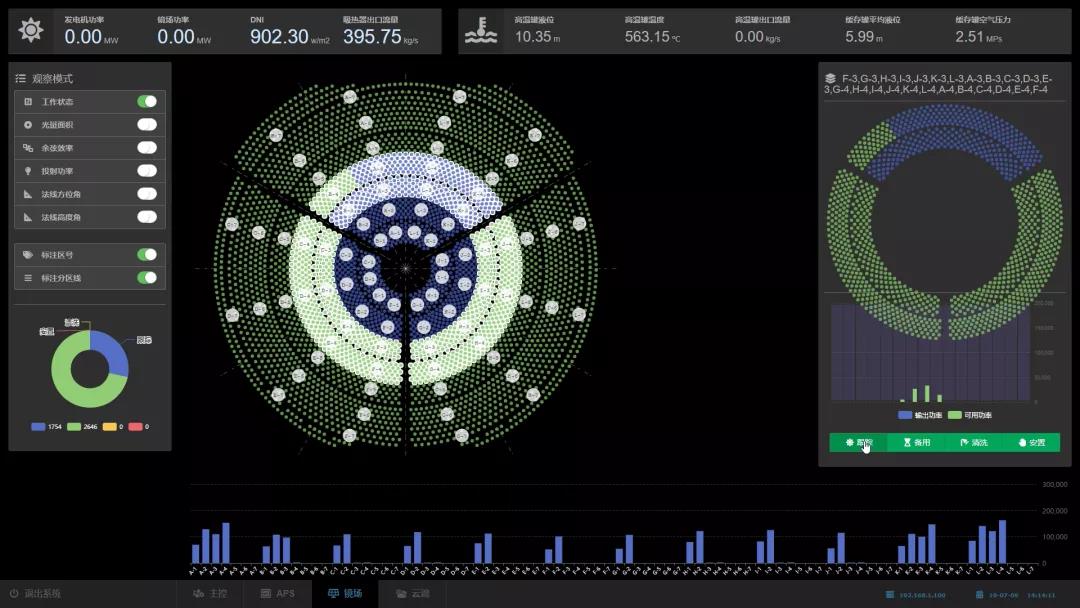 光热电站仿真机可以让运行人员实时监视塔式光热电站中整个定日镜场的工作状态,并且能够根据光热电站运行工况需要,按照分区对全场的定日镜进行控制。
