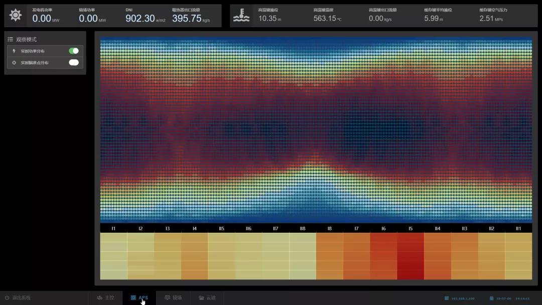 中国能建西北院开创性地在光热电站仿真机中引入了定日镜光斑叠加与吸热器表面能流密度分布的实时动态仿真,运行人员可以直观监视吸热管屏表面随着光资源变化的能流密度与温度场的分布情况,从而及时调整定日镜跟踪策略,防止吸热器过热损坏。
