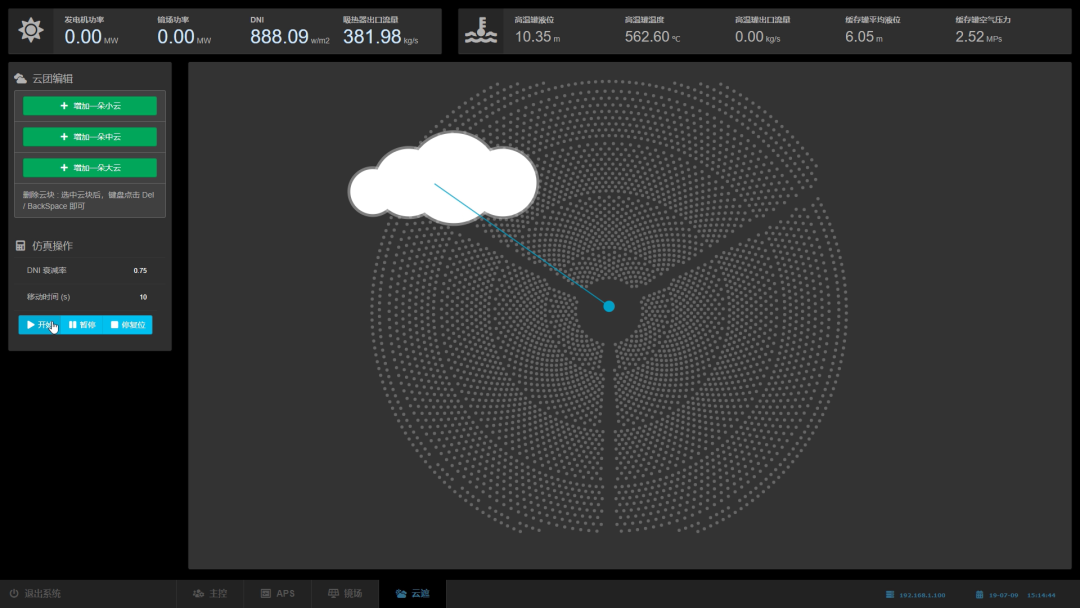光热电站仿真机还具备交互式定日镜场云遮仿真功能,用户可自定义云朵形状与厚度,模拟云遮运行工况,提高运行人员处理该特殊工况的应对能力。