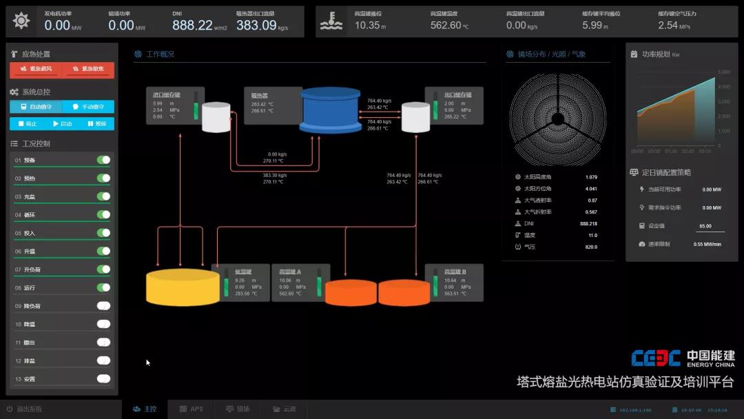 运行人员可以基于该仿真机完成吸热器预热、熔盐泵充盐、熔盐循环、定日镜投入、应急事故处理等系列操作,完成光热电站的全过程启动,其操作界面和电站实际操作全部一致。