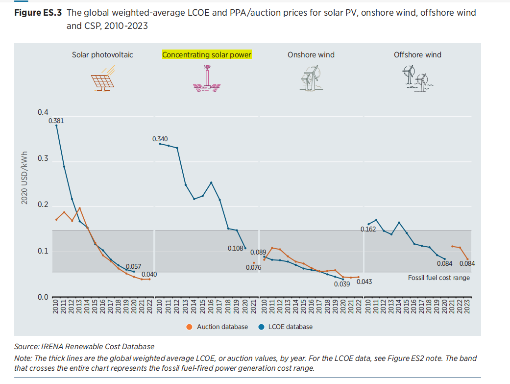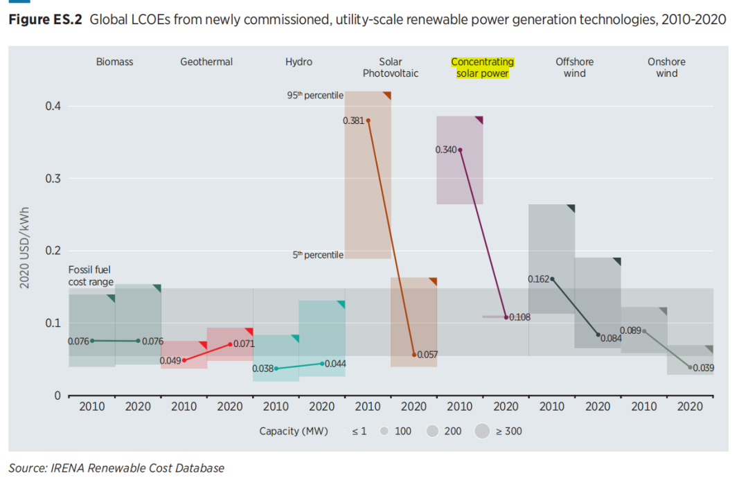 2010-2020年间,太阳能热发电全球加权平均电力成本(LCOE)从 0.340 美元/kWh降至 0.108 美元/kWh(约合0.7014元/kWh),下降了 68%,下降幅度仅次于公用事业规模的太阳能光伏发电(为85%)。