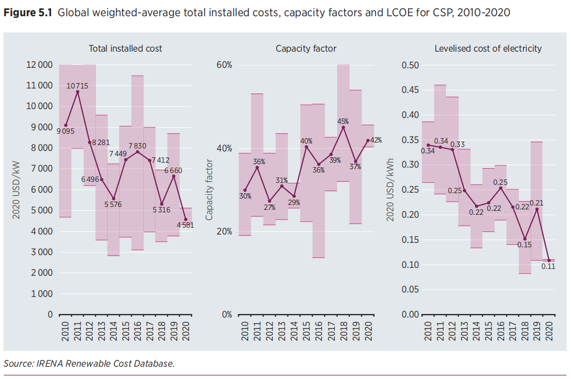全球新投产太阳能热发电站的加权平均容量因子*(译者注:capacity factor,太阳能热发电厂在规定时间段内实际输出的电量与满负荷条件下输出电量之比,时间段一般为年)从 2010 年的 30% 增加到 2020 年的 42%——十年间增长了 41%。与所有太阳能和风能技术一样,特定项目的容量因子取决于资源的质量、使用的技术和所需的运行条件。 对于太阳能热发电而言,太阳能资源的质量以及技术配置是在给定位置和技术可实现的容量因子的决定性因素。太阳能热发电技术有点独特,因为它具有整合低成本的热能储存的潜力,从而增加容量因子- 达到一定水平,并降低 LCOE。