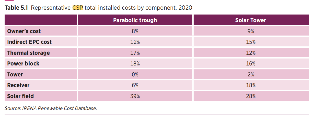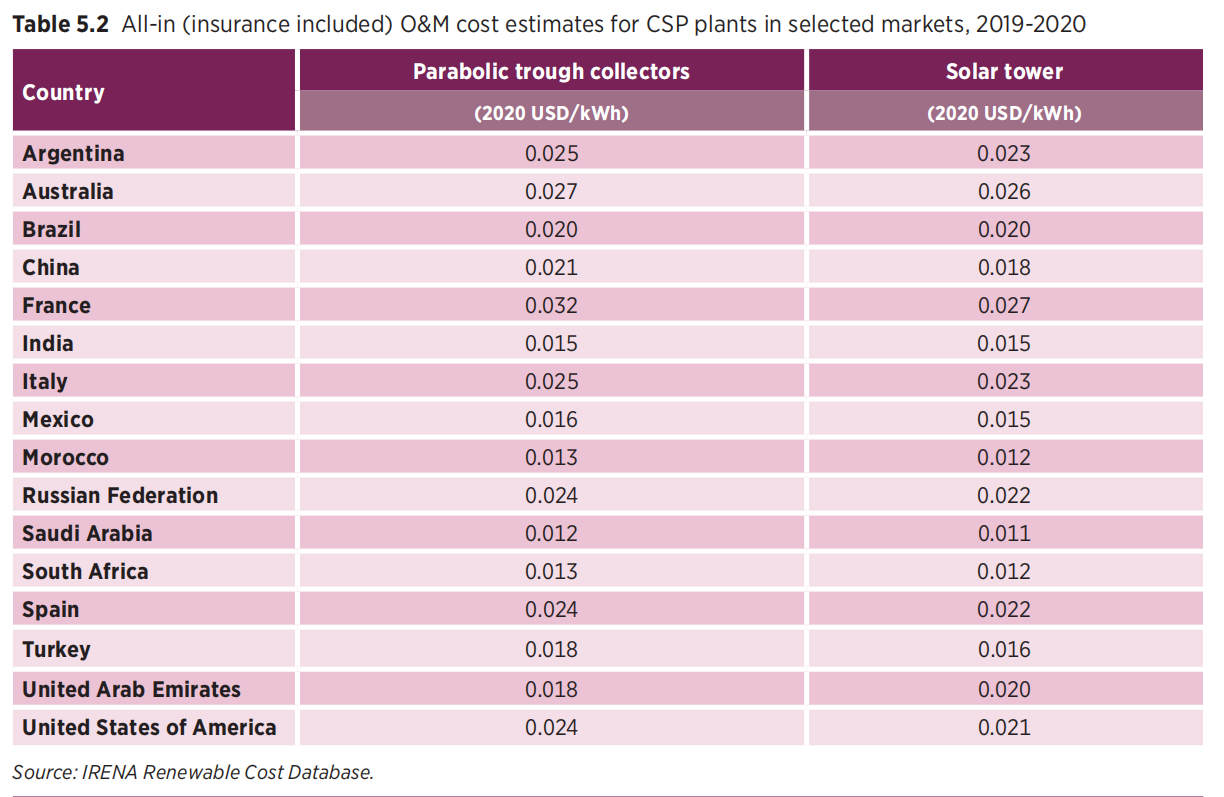 从 2010 年到 2020 年,在储热容量也增加了的情况下,太阳能热发电项目的总安装成本下降了一半 (50%)。除了一些例外,目前仍在运营的早期太阳能热发电厂的典型 O&M (运维)成本从 0.02 美元/kWh(约合0.1299元/kWh) 到 0.04 美元/kWh(约合0.2598元/kWh) 不等。这可能是对 2010 年左右建成的全球项目相关市场当前运维水平的一个很好的近似值。(译者注:青海中控德令哈50MW光热电站2019年7月26日-2020年7月25日期间,运营成本约合0.14元/kWh,其中人员费占64.7%,若电站规模扩大至100MW以上,运营成本可以控制在0.08元/kWh以内。)